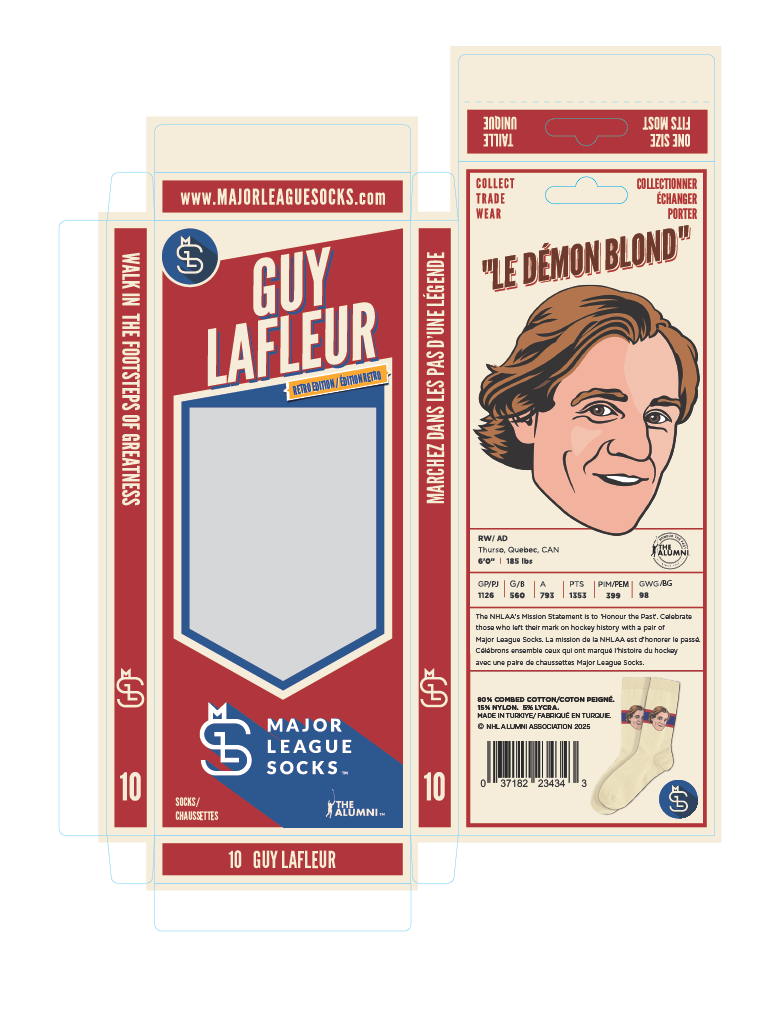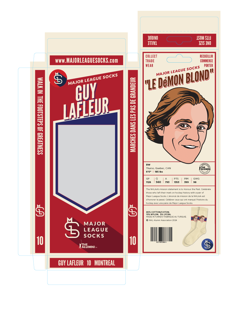 Nicknamed "Le Demon Blond". Lafleur was known for his long hair, wild rushes, and BOOMING shot. Add hockey history to your top drawer with this legendary pair of socks.