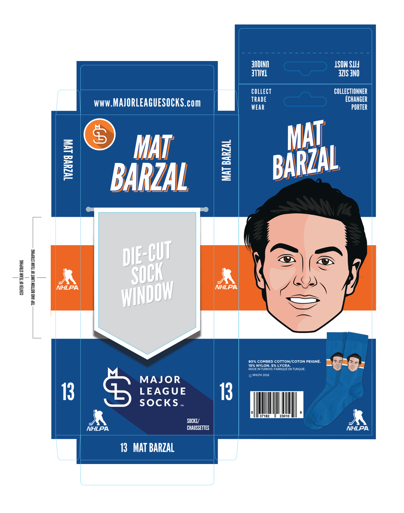 A perfect head of hair for a player that skates like the wind. Mat Barzal is turning heads in Long Island! A very sharp pair for your sock drawer.
