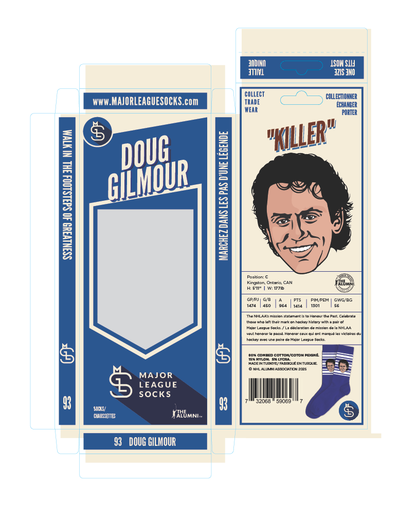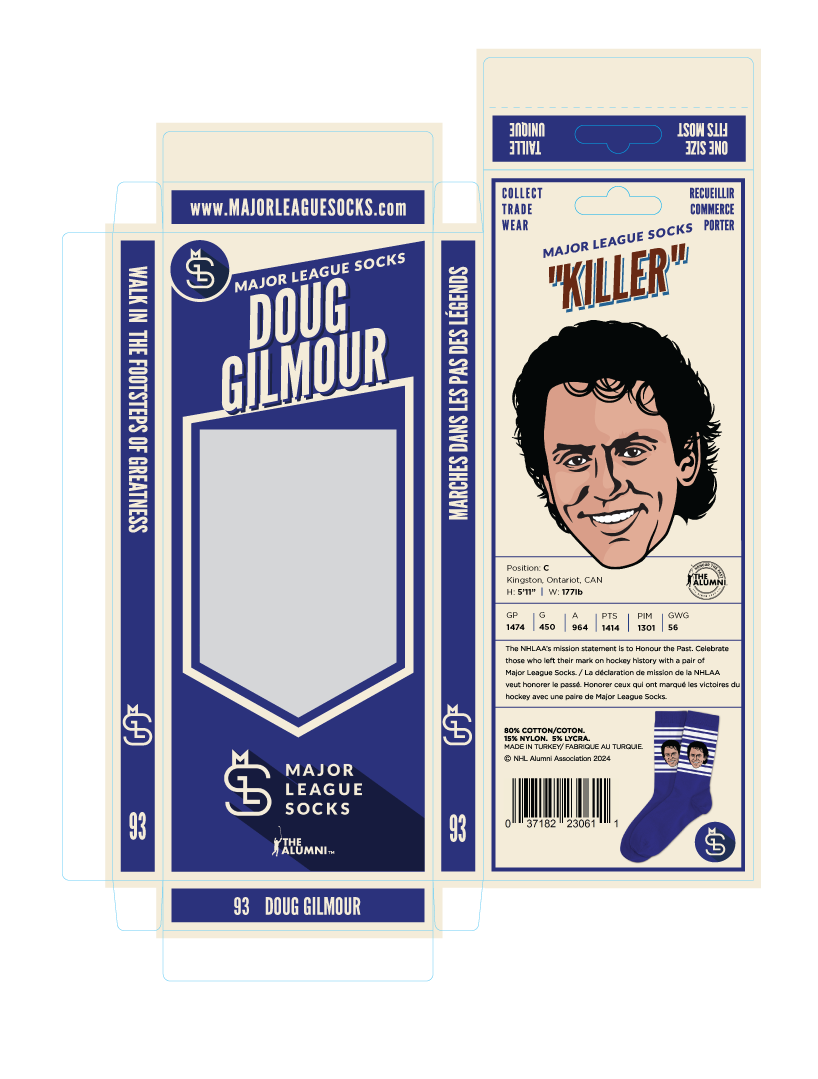 An absolute warrior on the ice. Dougie was at one point the best player in the world, Don Cherry proved it with a kiss on the check. Add hockey history to your top drawer with this "Killer" pair of socks.